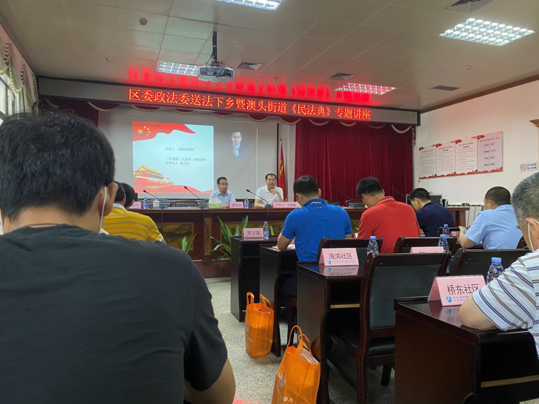为深入学习贯彻全国“两会”精神,理解好、贯彻好、运用好民法典。2020年9月4日,广东宝晟(大亚湾)律师事务所曾保育副主任受大亚湾区委政法委邀请,到惠州市大亚湾澳头街道办事处开展“送法下乡活动暨澳头街道《民法典》专题”法治讲座。