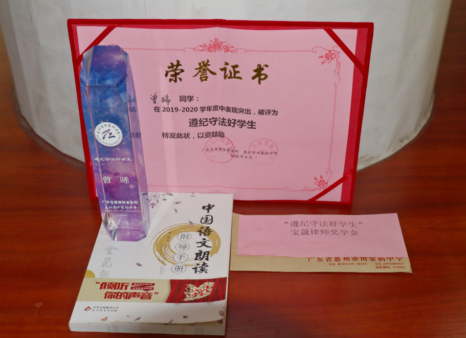 2020年7月2日上午,惠州市田家炳中学第一届“遵纪守法好学生”宝晟律师奖学金颁发典礼正式举行。宝晟所党建指导员、荣誉主任江晓华律师、党支部书记曾韵冰律师、副主任江迪彪律师以及黄淋律师受邀出席了本次颁奖仪式。