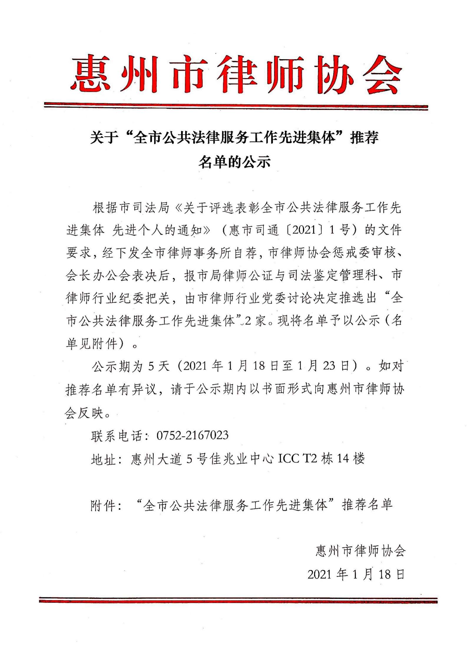 关于“全市公共法律服务工作先进集体”推进名单的公示