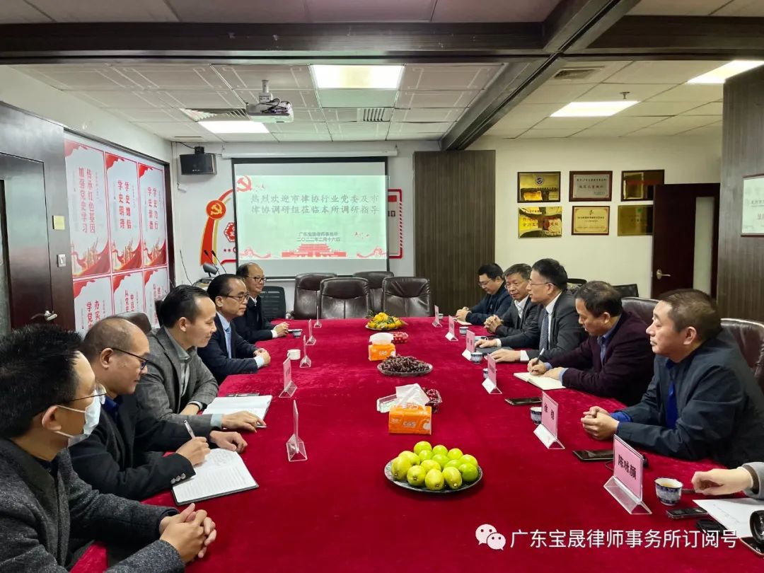 为进一步推动惠州律师事业高质量发展,2022年2月16日,市律师行业党委及市律协调研组成员:会长周涌、监事长徐焕茹、理事欧阳俊胜、监事徐稳、秘书长李育辉、会员部副主任陈咏颜一行6人到广东宝晟律师事务所开展走访调研活动。宝晟所主任刘湖森、荣誉主任江晓华、管委会主任刘家峰、合伙人林智强、徐峰等人热情接待并参加座谈。