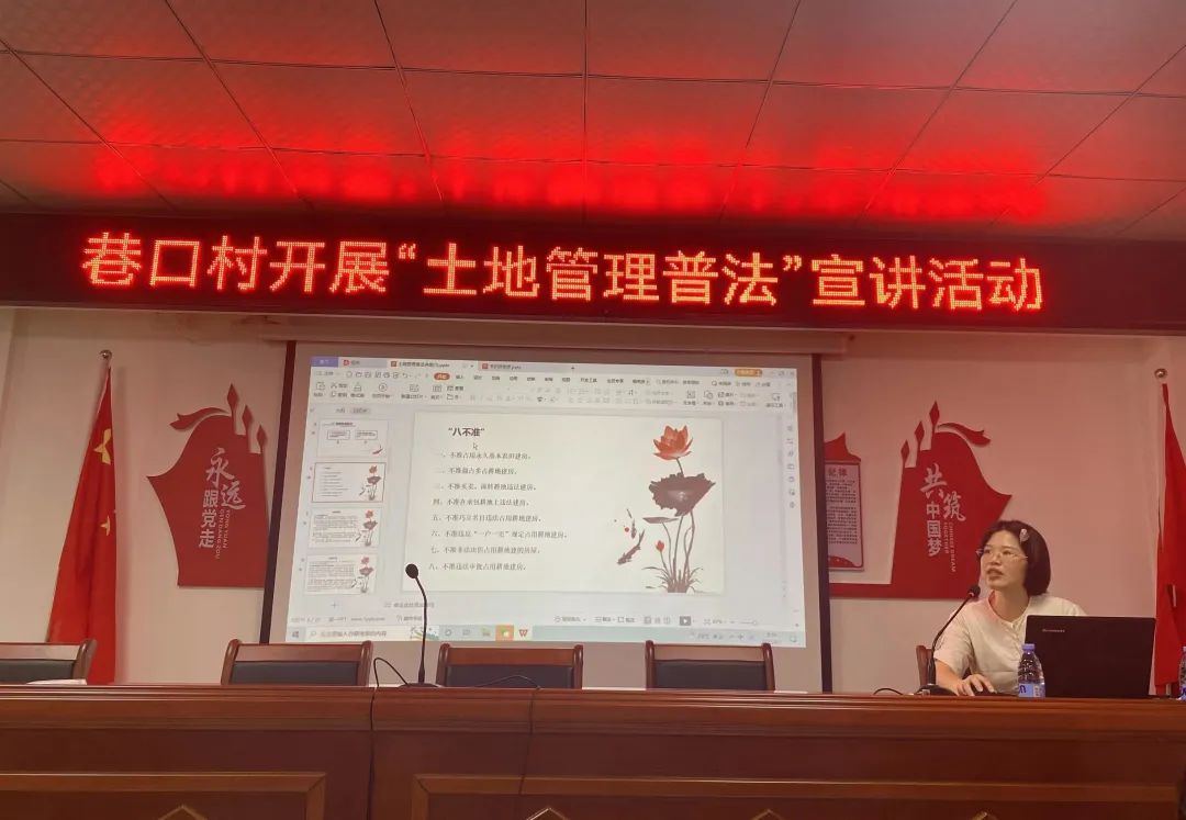 活动第二项议程:谢衡衡党员律师以《中华人民共和国土地管理法》为主题,向巷口村的村委干部、村小组成员进行法治宣讲。谢律师对耕地保护、土地承包经营权三权分置、宅基地制度三个板块进行了讲解,重点围绕耕地保护并结合多个实际案例向村委干部、村小组成员详细解读,为提高村民耕地保护意识,加强土地管理法规学习,落实乡村振兴战略助力。