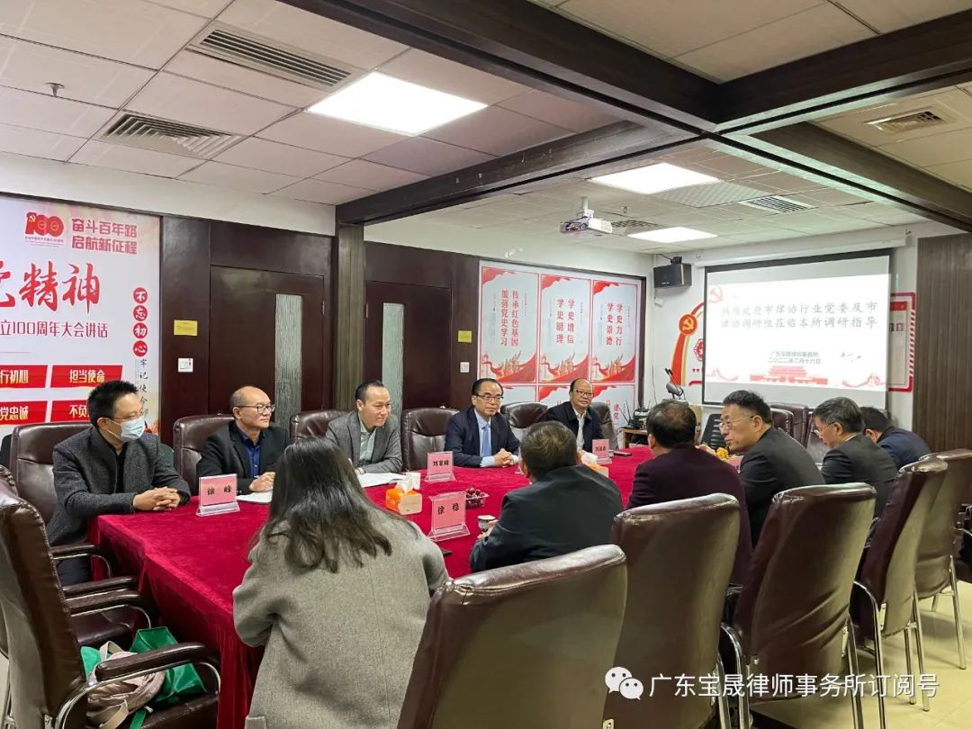 为进一步推动惠州律师事业高质量发展,2022年2月16日,市律师行业党委及市律协调研组成员:会长周涌、监事长徐焕茹、理事欧阳俊胜、监事徐稳、秘书长李育辉、会员部副主任陈咏颜一行6人到广东宝晟律师事务所开展走访调研活动。宝晟所主任刘湖森、荣誉主任江晓华、管委会主任刘家峰、合伙人林智强、徐峰等人热情接待并参加座谈。