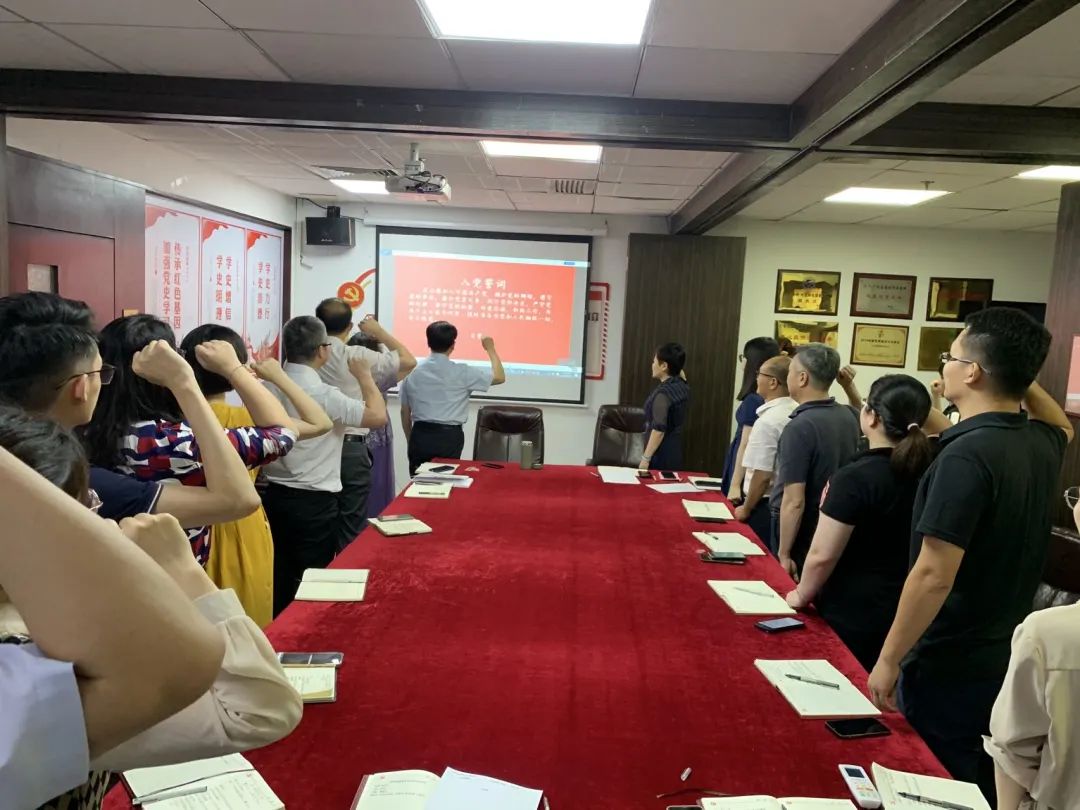 会议第二项议程,重温入党誓词,凝聚奋斗力量。全体党员、入党积极分子在党支部书记曾韵冰同志的带领下,举起右拳,庄严宣誓。句句铿锵的誓言,将激励全体党员、入党积极分子永葆对党忠诚这一政治品格,不忘初心担使命,砥砺前行再出发。