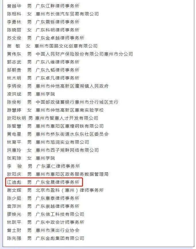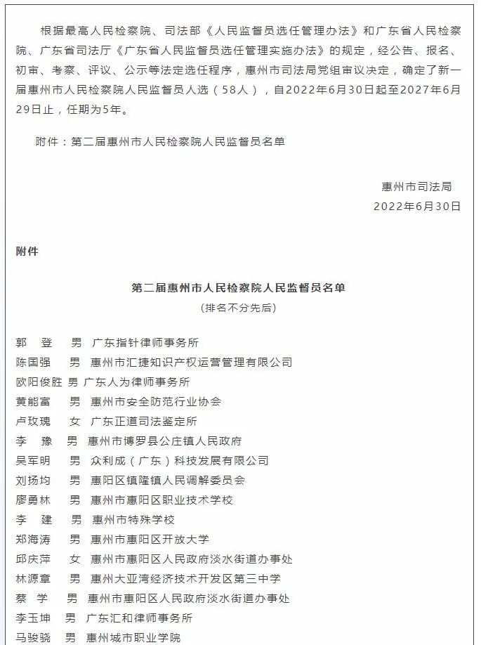 惠州市司法局于2022年6月30日公布了新一届惠州市人民检察院人民监督员人选名单,我所江迪彪律师被选任为第二届惠州市人民检察院人民监督员,任期为5年,自2022年6月30日起至2027年6月29日止。