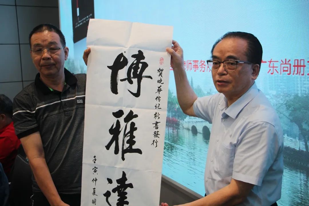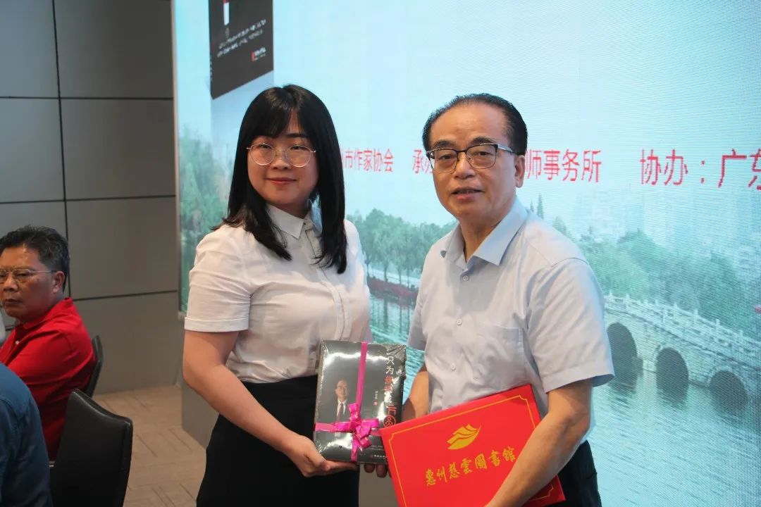 会上我所荣誉主任江晓华向惠城区档案馆、惠州慈云图书馆赠书,在此,曾婷婷副馆长代表惠州慈云图书馆赠送证书 ,郑国梁先生赠送书法作品。