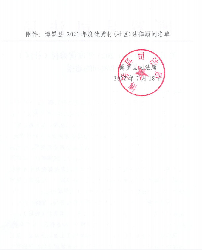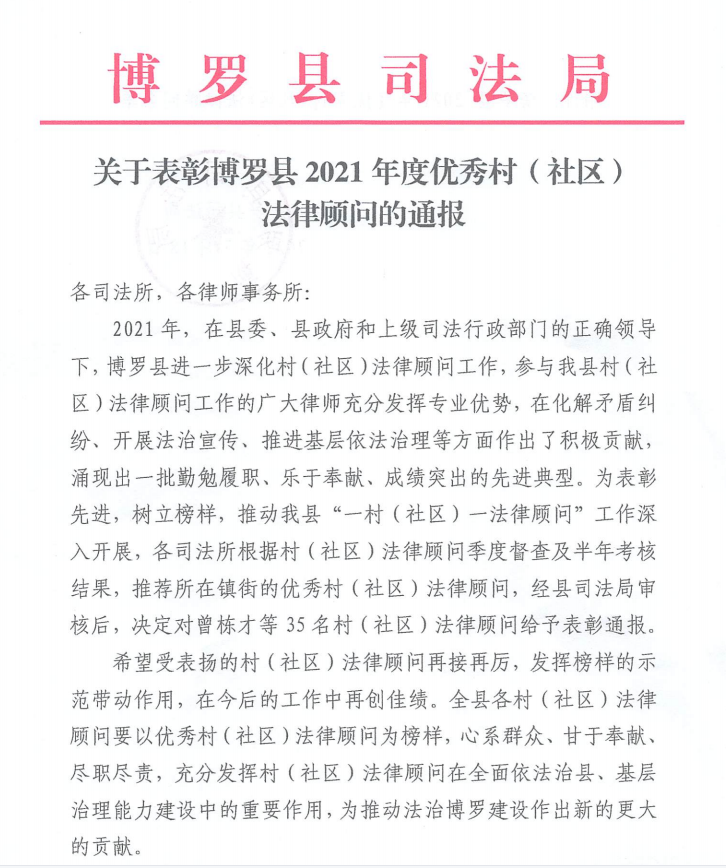 近日,为表彰先进,树立典型,传递榜样力量,弘扬法治精神,进一步激励基层民主法治创建活力,惠州市博罗县司法局公布《关于表彰博罗县2021年度优秀村(社区)法律顾问的通报》,分别对在博罗县2021年度村(社区)法律顾问工作中表现突出、群众满意率高且热心公益的35名优秀村(社区)法律顾问予以表彰。