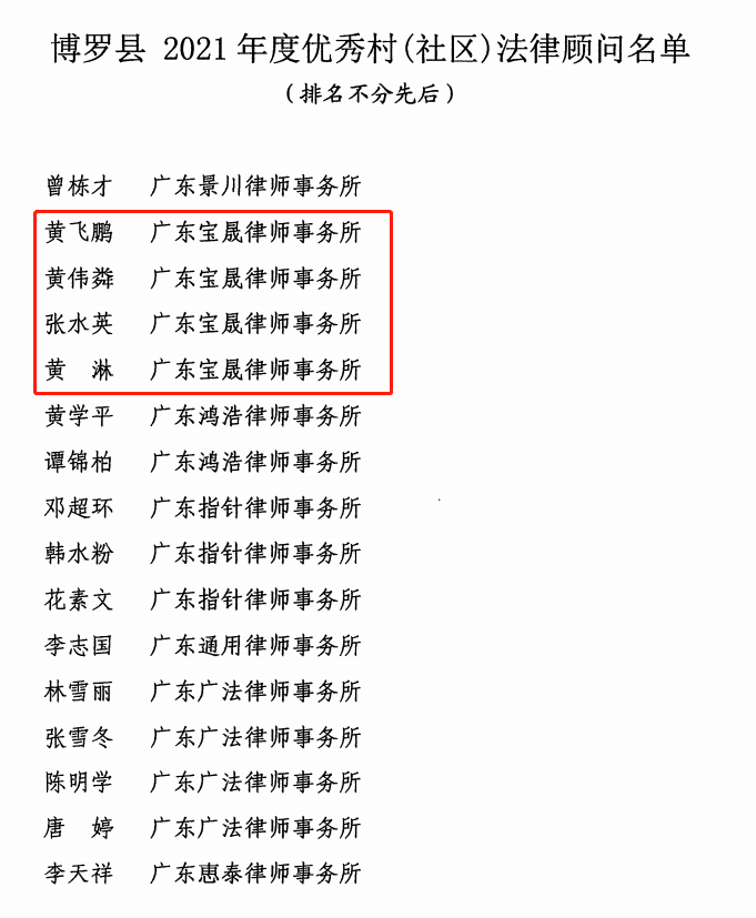 其中广东宝晟律师事务所黄伟粦律师、黄淋律师、张水英律师、黄飞鹏律师荣获“博罗县2021年度优秀村(社区)法律顾问”表彰。