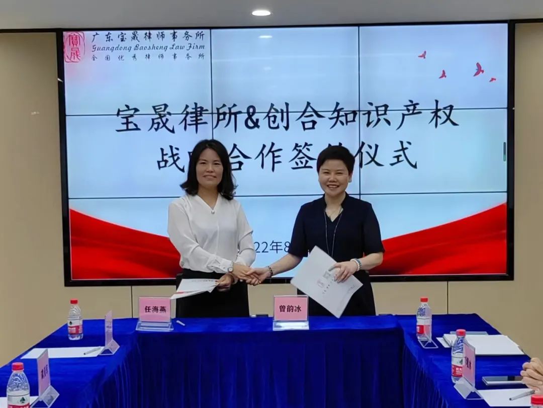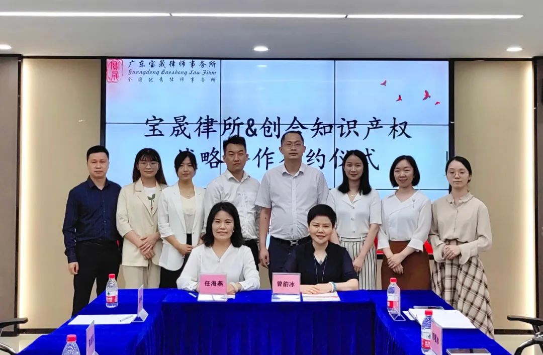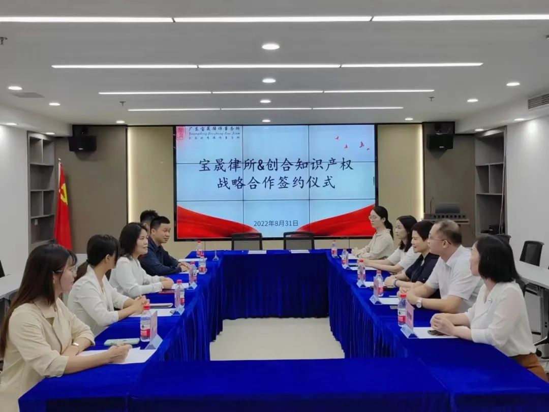 为积极响应惠州入选国家知识产权强市建设试点城市,2022年8月31日上午,广东宝晟律师事务所(以下简称宝晟所)与广东创合知识产权代理有限公司(以下简称创合知识产权)战略合作框架协议签约仪式在广东宝晟律师事务所会议室顺利举行。创合知识产权创始合伙人总经理任海燕及合伙人团队成员龚漫军、赵瑾、李伟保、符晓妮,宝晟所党支部书记曾韵冰律师及管委会主任黄伟粦律师、管委会副主任刘墁冰律师、赵秀娟律师、叶淑芬律师出席本次签约仪式。