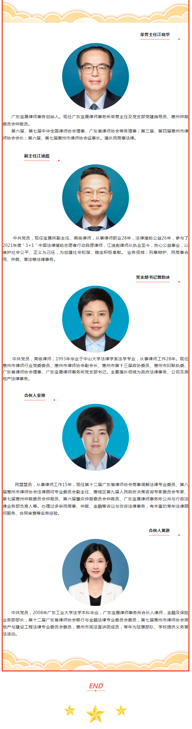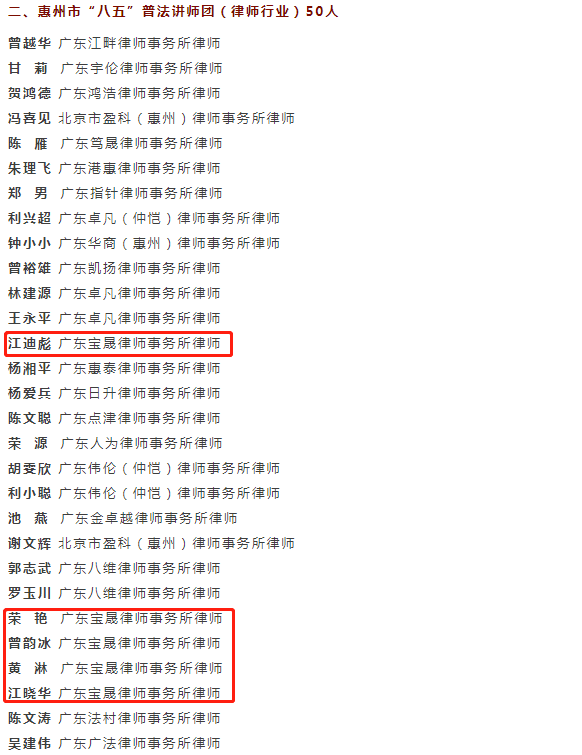 近日,市委宣传部、市司法局联合印发《中共惠州市委宣传部 惠州市司法局关于成立惠州市“八五”普法讲师团的通知》,惠州“八五”普法讲师团正式成立。其中,我所江晓华律师、江迪彪律师、曾韵冰律师、荣艳律师、黄淋律师入选成为惠州市“八五”普法讲师团成员。