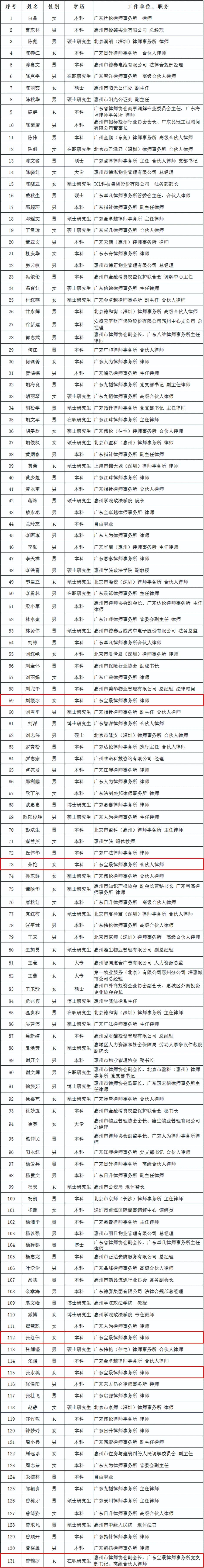 2022年9月4日,我所曾韵冰律师、荣艳律师、张红伟律师、刘墁冰律师、张水英律师经过公开选聘,成功入选惠州市惠融国际商事调解中心第一届调解员(名单详见下表),聘期四年。