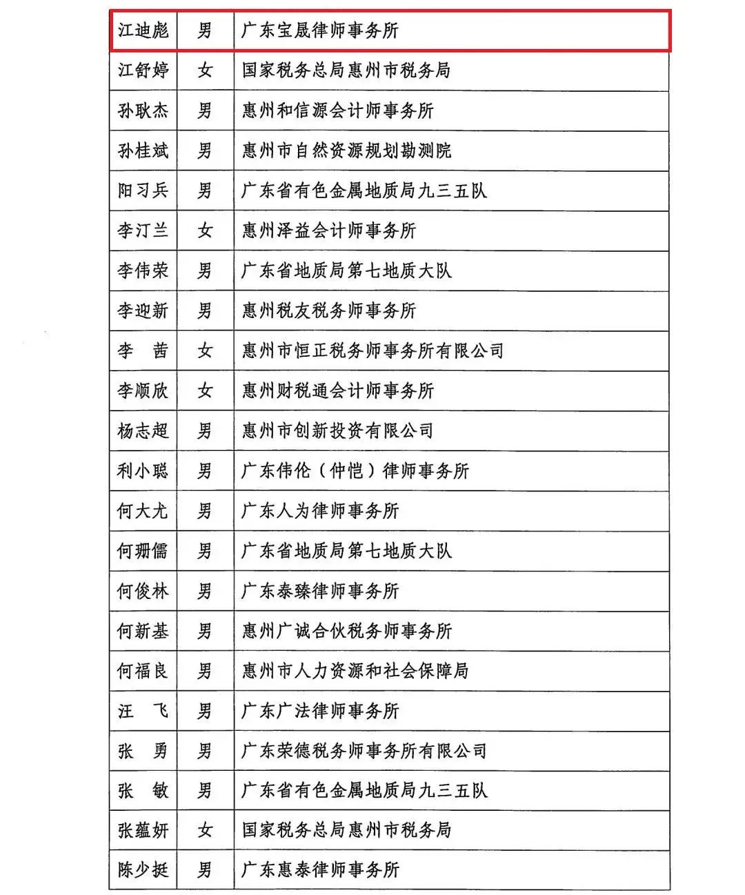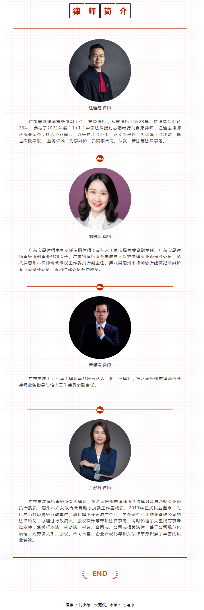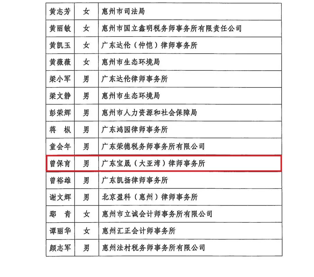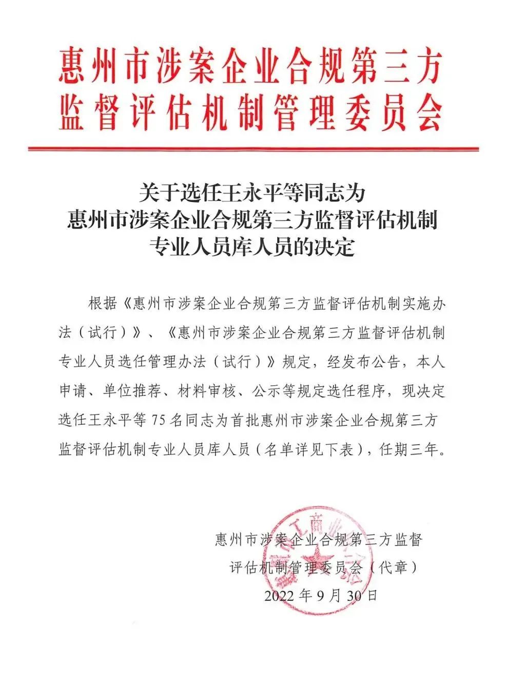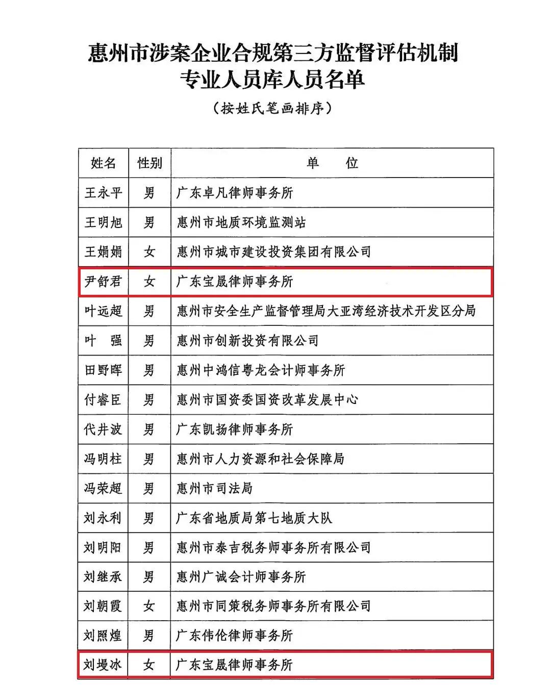 根据《惠州市涉案企业合规第三方监督评估机制实施办法(试行)》、《惠州市涉案企业合规第三方监督评估机制专业人员选任管理办法(试行)》规定,经发布公告,本人申请、单位推荐、材料审核、公示等规定选任程序,选任出75名同志为首批惠州市涉案企业合规第三方监督评估机制专业人员库人员,其中,宝晟所江迪彪律师、刘墁冰律师、曾保育律师、尹舒君律师入选惠州市涉案企业合规第三方监督评估机制专业人员库人员,任期三年。